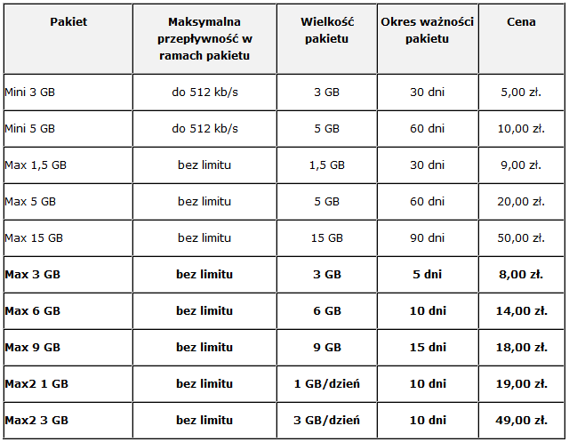 Max1,5 do 3 Mb/s 1,5 GB 30 dni 9,00 zł Max10 do 3 Mb/s 10 GB 60 dni 35,00 zł Max15 do 3 Mb/s 15 GB 90 dni 50,00 zł Funkcja SZUKAJ jest za darmo, nie na darmo. Moje oferty na olx.pl