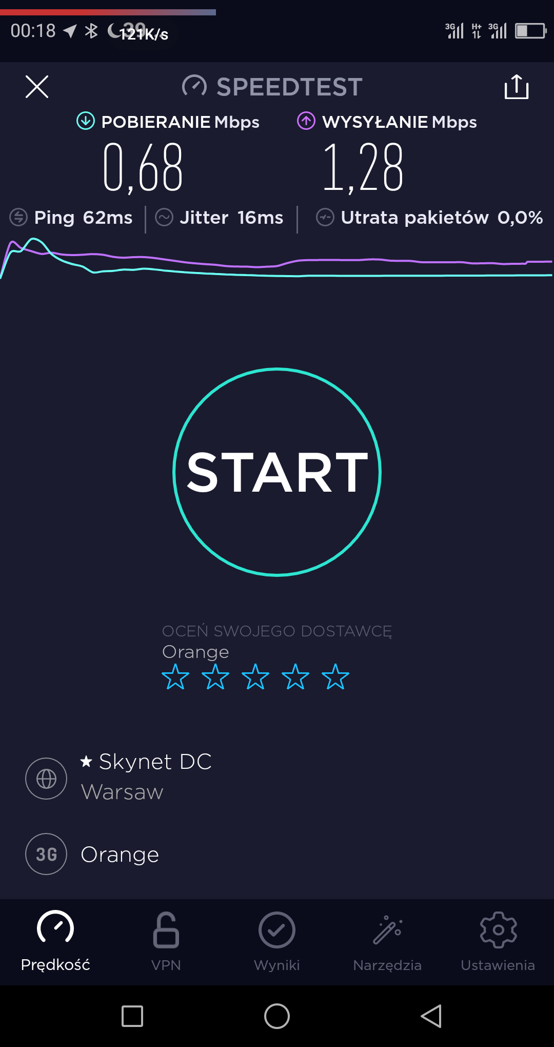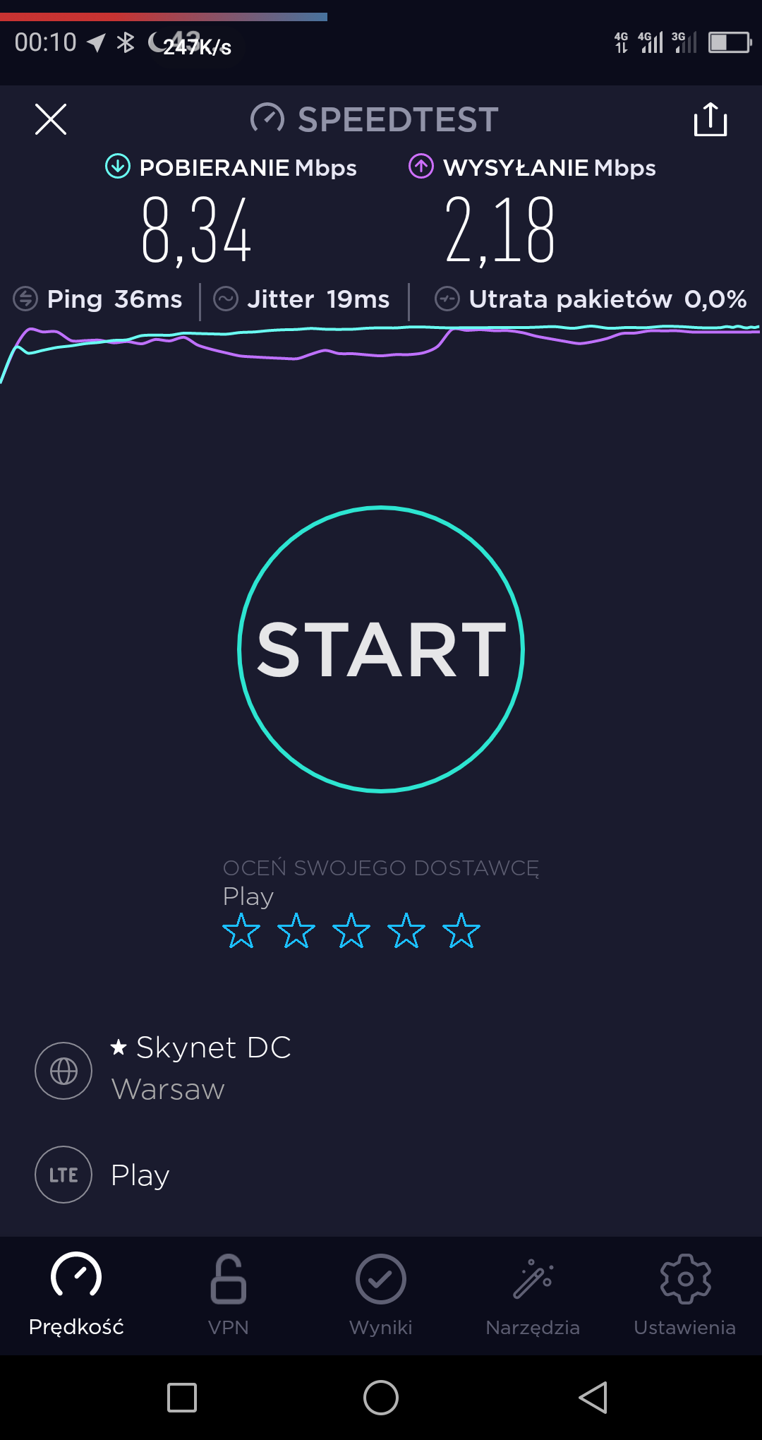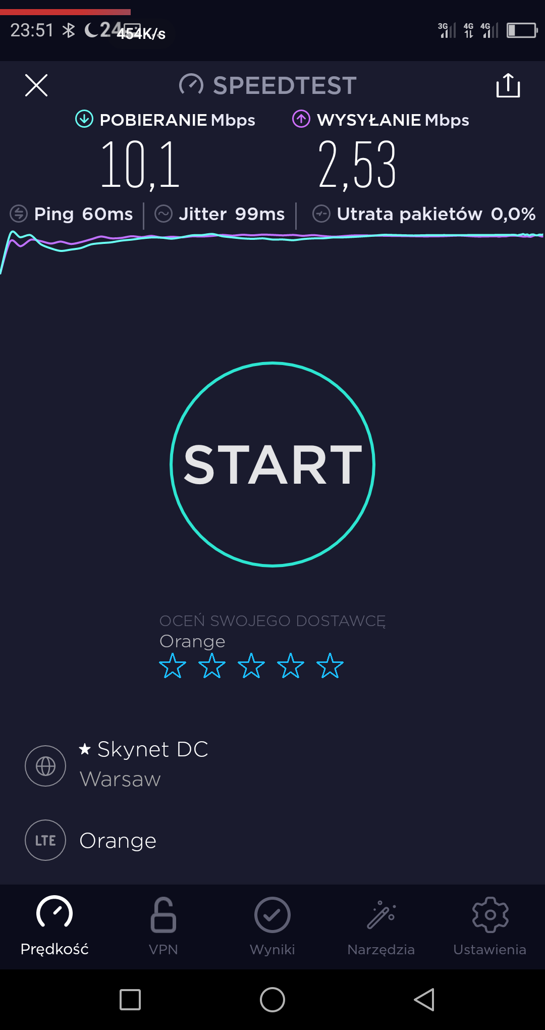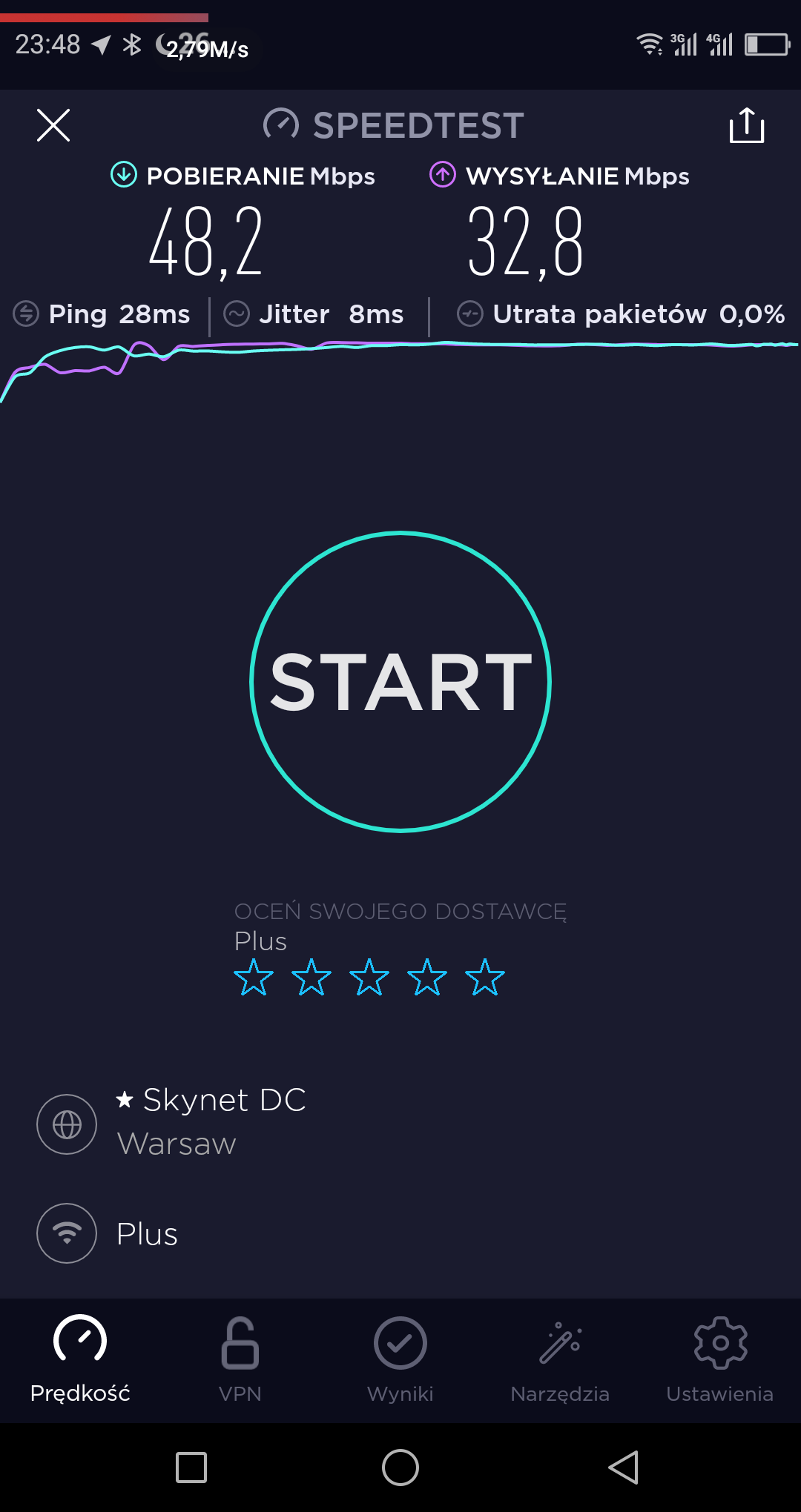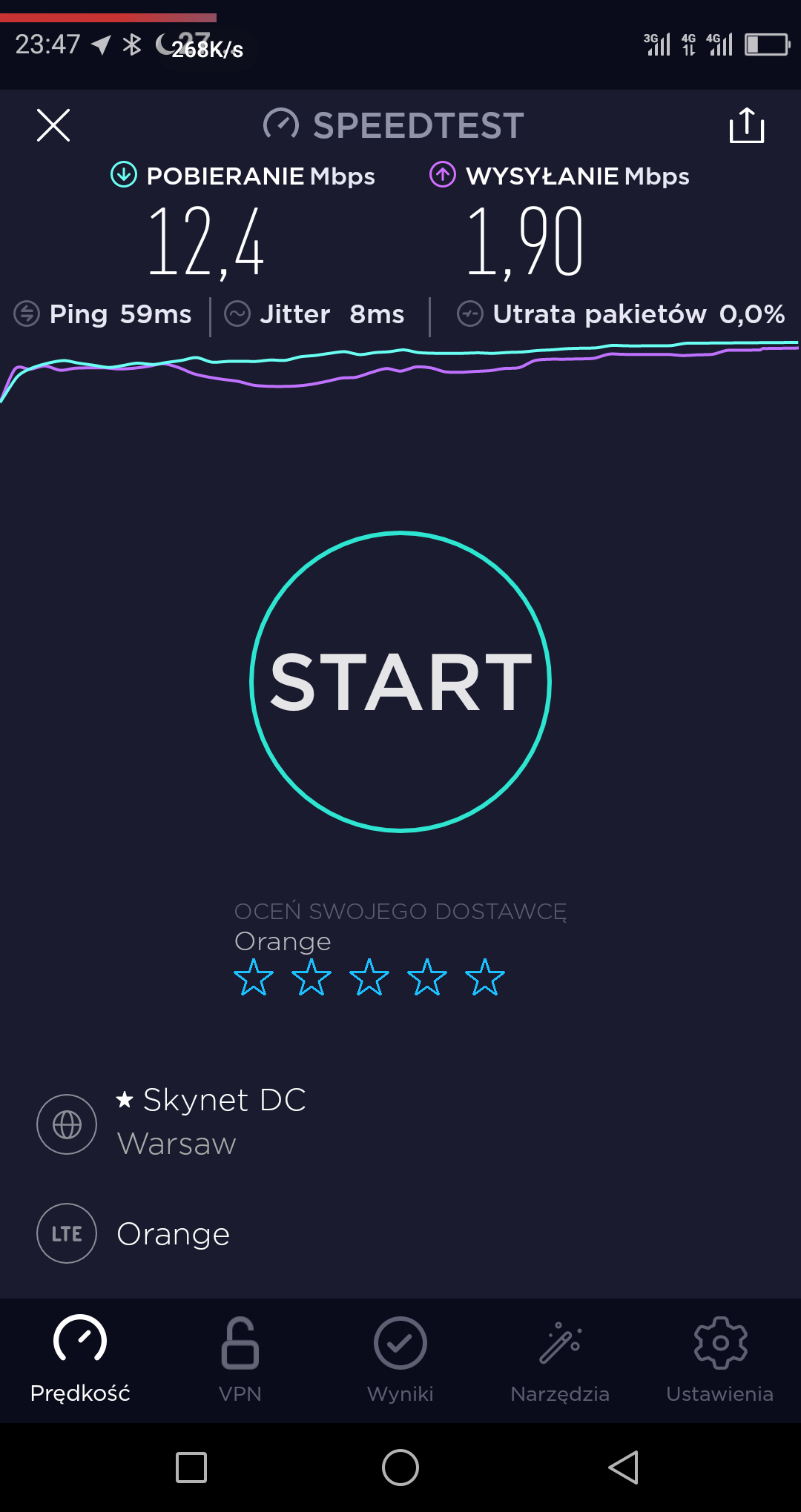 I jeszcze jedna kwestia - pomiary systematycznie wykonuję do warszawskiego Skynet DC, bo domyślny serwer w ookla speed teście jest dobierany na podstawie najniższego pingu (czyli wygrywa ten który jest najbliżej w sieci danego operatora, co oczywiście nieco fałszuje wyniki w "lepszą" stronę, a mnie interesują wyniki możliwie najbardziej realne, a nie najwyższe).