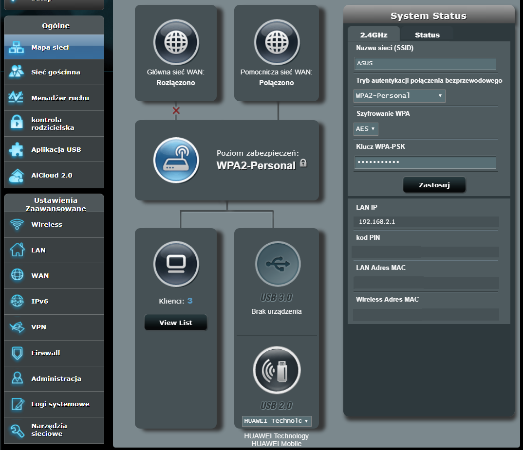 obecnie masz "WAN" a powinieneś tam wybrać "USB" (lub coś kojarzącego się z modemem) swoją drogą modem powinien zostać wykryty wraz z jakąś nazwą go identyfikującą (choćby coś w stylu "Huawei modem" ale wydaje mi się, że przy poprawnej identyfikacji zobaczysz także jego model) PS kartę SIM masz z wyłączonym żądaniem PINu? PPS chyba każdy współczesny Asus na fabrycznym sofcie obsługuje podłączenie drukarki skoro masz taki plan to powinieneś się wyposażyć w aktywny hub USB (z zasilaczem) - to umożliwi podłączenie kilku urządzeń USB równocześnie i w dodatku zlikwiduje ewentualny problem niedoboru zasilania modemu USB i nie żałuj screenshotów i jeszcze jedno - zamiast modemu testowo możesz także podpiąć smartfona (na androidzie) z włączonym tetheringiem USB (to się da włączyć w telefonie dopiero po podpięciu do routera, więc jako rozwiązanie na stałe raczej się nie nada, ale do testów czemu nie?) Statystyki Folding@home |