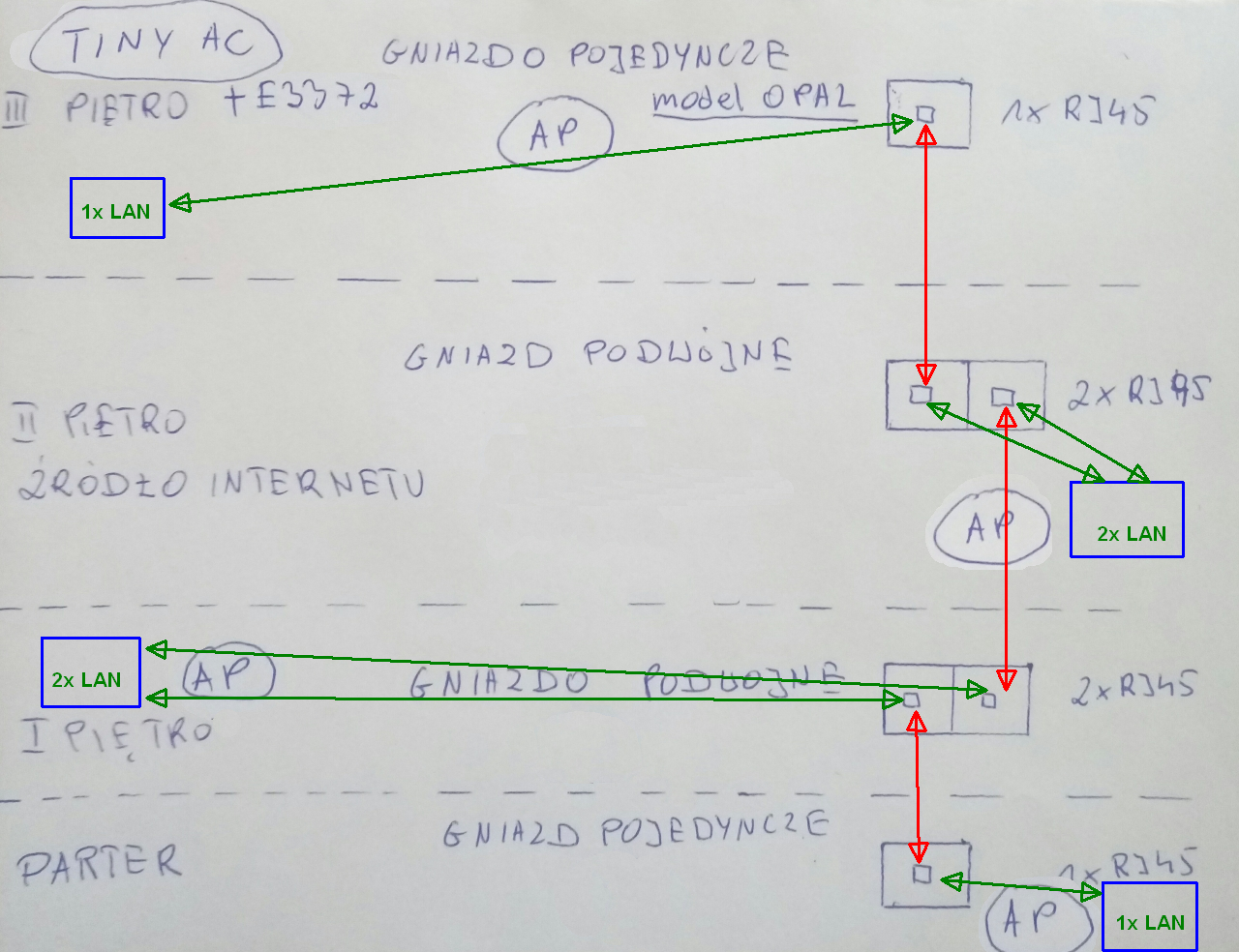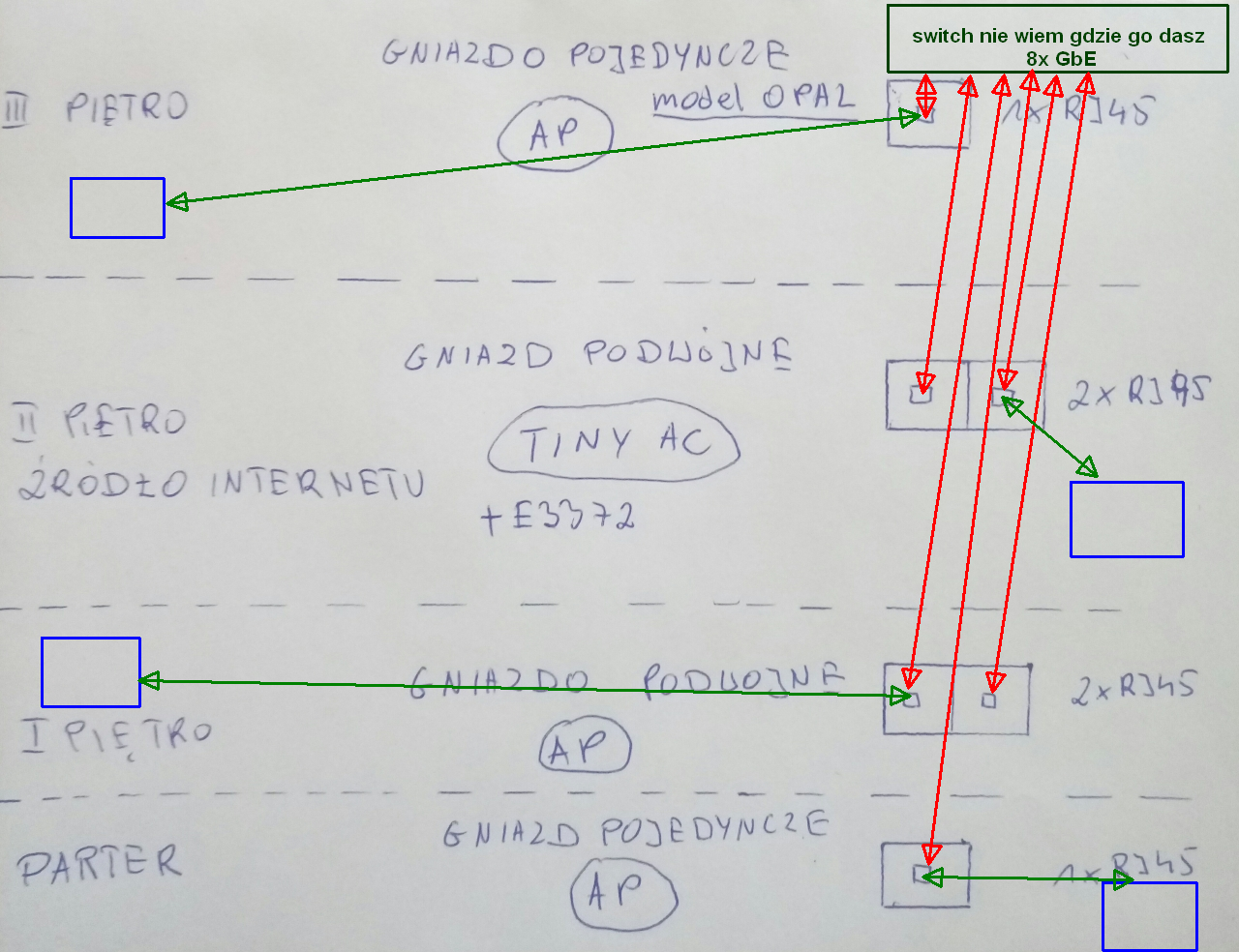 Ja to widze tak tylko nid jestem pewien jednej rzeczy ale to pozniej. Tiny na 2 pietrze obok niego podpiety switch a od switcha kabel do gniszdka podwojnego jedno wejscie na gore (3 poetro AP) a drugie wejście ze switcha na 1 piętro AP. Pomijam póki co parter. I teraz czy gniazdko podwojne to sa dwa rozne wyjscia czy te same? Moze tak byc? Wszytko bylo by na osobnym kablu.