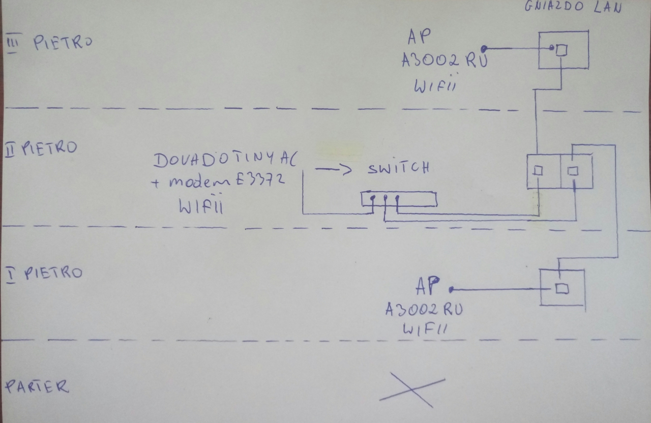 jeśli peszle masz np. do piwnicy lub na strych - to tam możesz dać switcha ewentualnie olewasz estetykę i podpinasz go bezpośrednio do kabli instalacyjnych poza gniazdem na jednym z pięter uwzględnionych na rysunku… przykładowe rozwiązanie na rysunku (założyłem, że kupisz 8-portowy switch gigabitowy, ale plan minimum to opięcie tylko gniazd tam, gdzie masz urządzenia więc wystarczyłby 5-portowy, mniejszych nie produkują, ale moim zdaniem taka oszczędność jest bez sensu, bo zostaniesz z jednym niedziałającym gniazdem) malojk napisał(a):Czy wylaczenie parteru z tej instalacji da cos?nie da, bo ani Tiny ani Tiny AC nie mają switcha więc dysponujesz tylko 1 wyjściem LAN (jeśli się da ustawić bridge między LAN i Ethernetowym WAN w twoim modelu, to się dałoby pozostawić Dovado na 2 piętrze i mieć taką samą funkcjonalność jak w rozwiązaniu z posta #41 http://forum.jdtech.pl/Watek-domowa-siec...5#pid41615 bez stosowania dodatkowego switcha, ale ja nie sprawdzę, bo nie mam obecnie takiego Dovado, ani w tym momencie już czasu na analizowanie manuala - ale nie rób sobie nadziei - na 99% nie jest to możliwe bo na szybko znalazłem takie info http://www.dovado.com/en/features/bridge-mode czyli tryb bridge w tym wypadku dotyczy tylko modemu i służy do czegoś zupełnie innego!) Statystyki Folding@home |