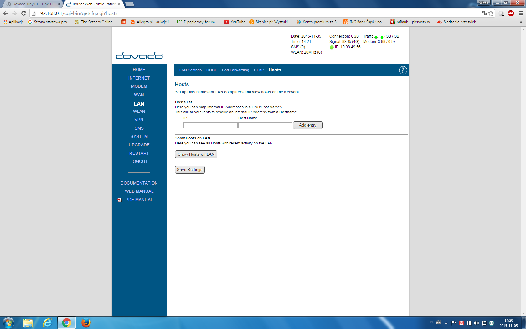 przełączyłem dovado z trybu pobierania internetu z usb na tryb pobieraj z wan, wiec teoretycznie powinno chodzić, tp-link ma wyłączone wifi bo aż tyle nie jest potrzebne, pracuje w trybie 3G i pobiera sygnał internetu tylko z huaweia który jest do niego podpięty, wszystko jest podpiete jak na rysunkach pozdrawiam |