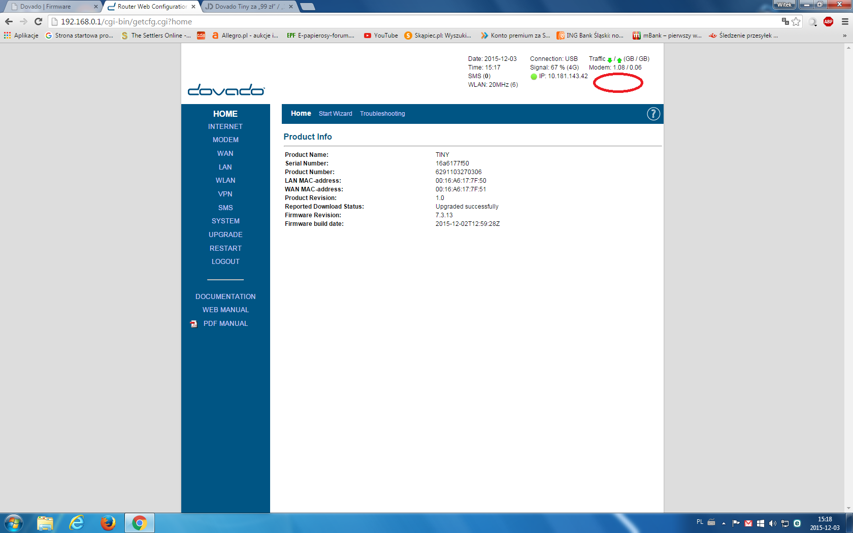 prośba o sprawdzenie do użytkowników tiny. dziś z rańca w w miejscu oznaczonym kółkiem pokazała mi się dodatkowa funkcja, posprawdzałem co to takiego i routerek sam może sprawdzać dostępnośc, aktualizować softa do najnowszego, w tej chwili u mnie hula już 7.3.13 pomimo że na stronie dovado jako najnowsza jest 7.3.12 do ściągnięcia
