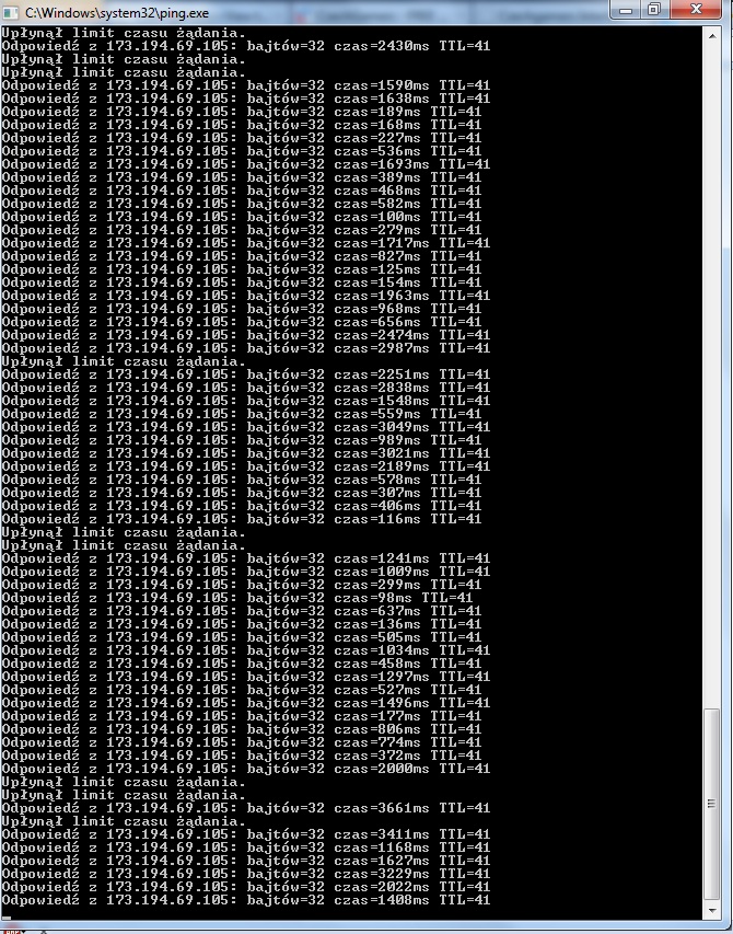 Od pewnego czasu w rożnych porach dnia i nocy pojawiają się ogromne pingi bądź ich nawet brak, połączenie jest nadal aktywne, siła sygnału wg Mobile Partner wynosi 97% w momencie gdy wogóle nie ma pingów poziom sygnału wynosi zero. Bywa też tak, że po idealnym wręcz połączeniu (60-70ms ping), po rutynowym godzinnym restarcie pingi są już 300+ i brak. Aktualizacje Windows 7 mam wyłączone nic nie ściągam, nie mam pojęcia czemu tak się dzieje. Lokalizacja to Warszawa Białołęka.