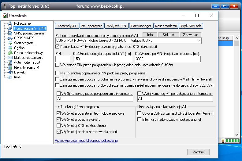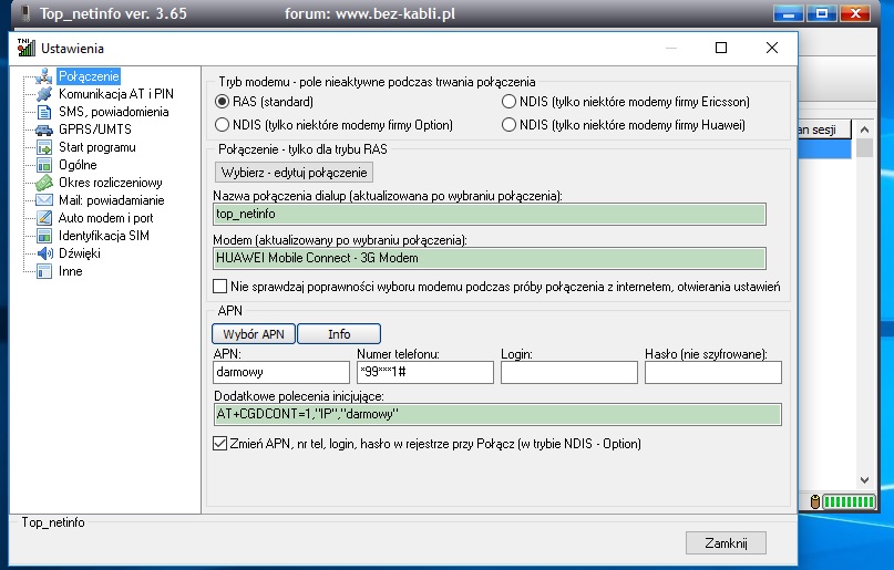 No i najlepiej zestaw połączenie choć raz za pomocą aplikacji fabrycznej (Mobile Partner/pochodne) sprawdzając, czy nie ma przypadkiem wymuszenia Tylko GSM. TopNetInfo nie ma opcji automatycznego odczytywania ustawień modemu, a tylko ustawiania tego, co wyklikałeś. Dlatego na start ja wolę testować modem i jego ustawienia za pomocą Mobile Partnera.
