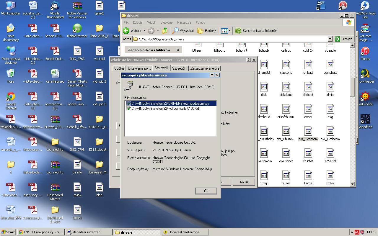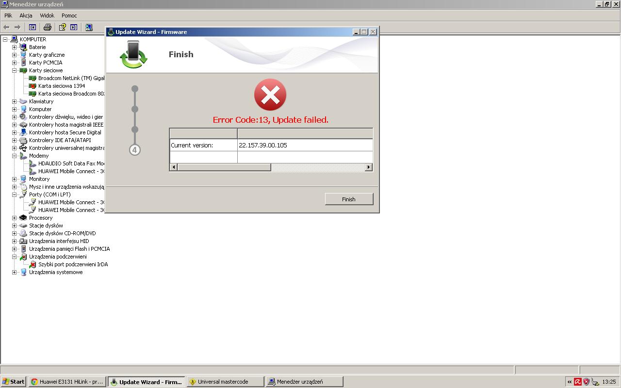http://forum.jdtech.pl/Watek-huawei-e313...le?page=12 post 116. daje mu te stery o ktorych mowisz ale mowi ze nie znajduje informacji o urzadzeniu w nich daje mu nawet inne : Huawei_Windows_Drivers_4.25.22.00 i tez klapa |