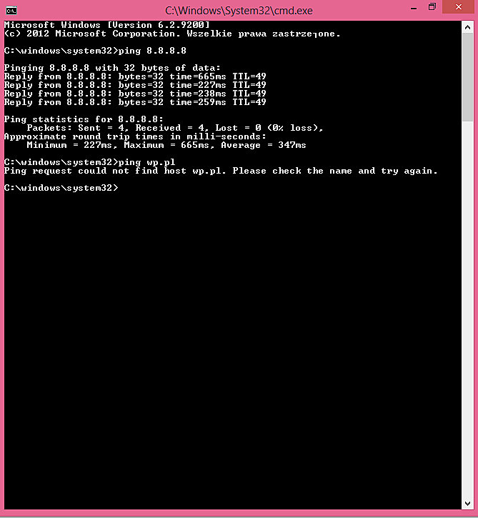 Poniżej zrzut z ekranu po wpisaniu wskazanych poleceń ping. W dalszym ciągu brak połączenia. Raz udało się połączyć ale połaczenie zostało zerwane po około 3-5 sekundach. Zdążyła się tylko otworzyć przypadkowo włączona strona główna wp.pl.