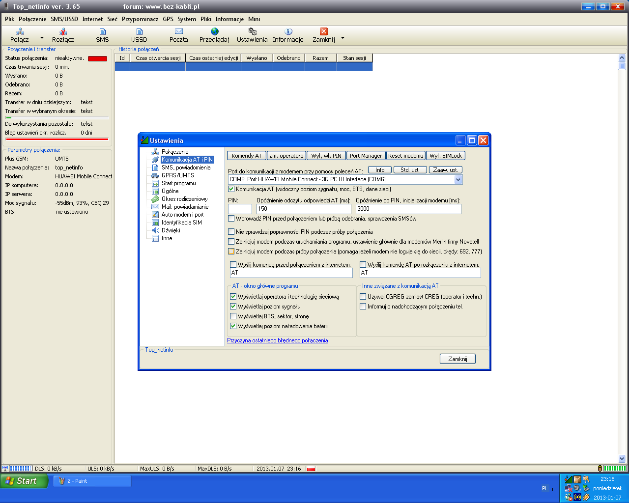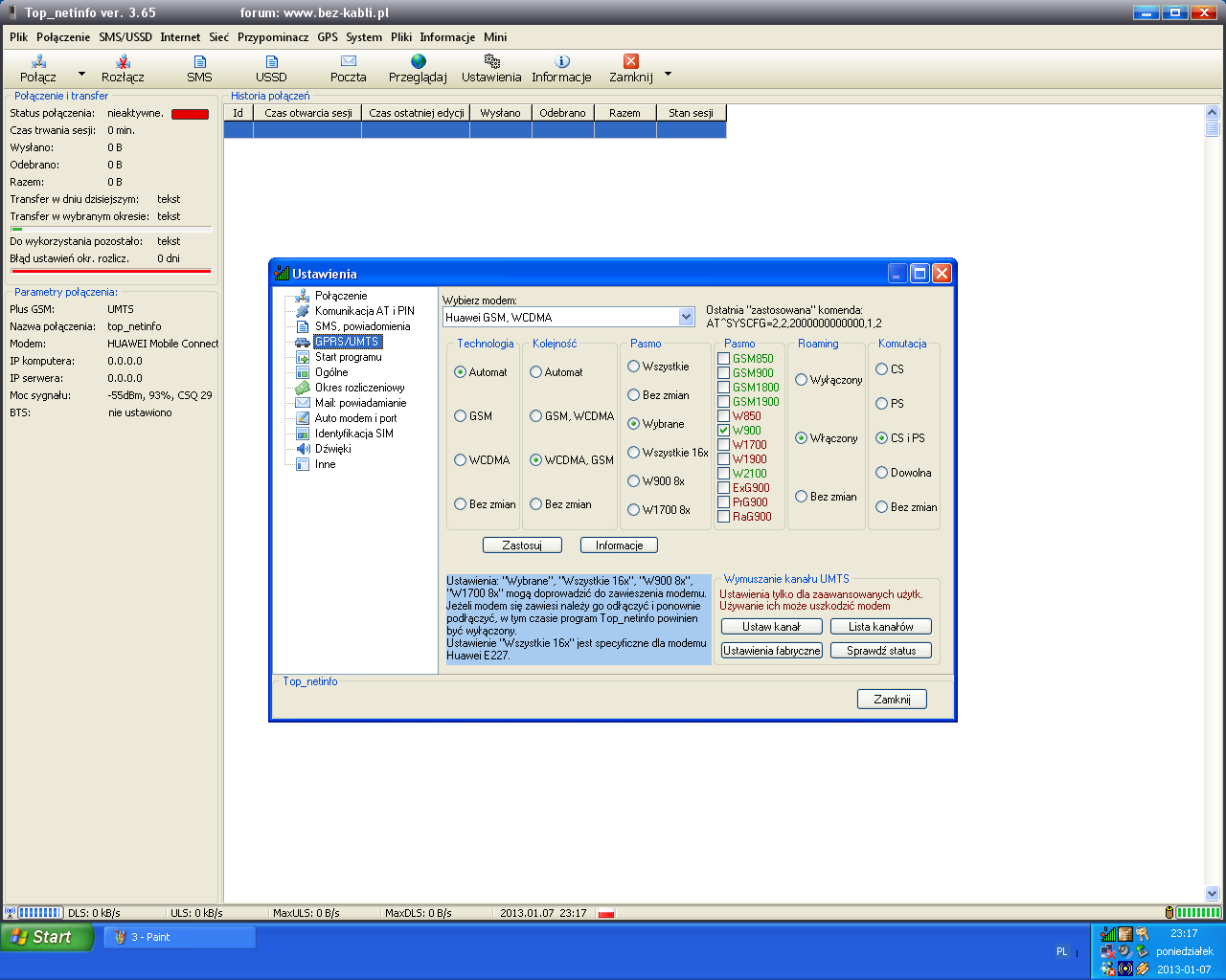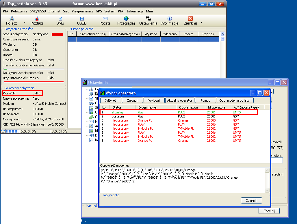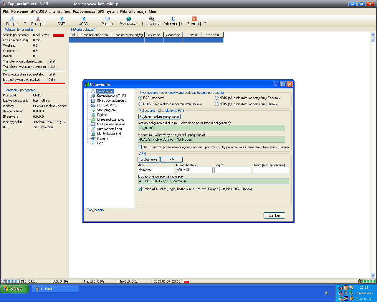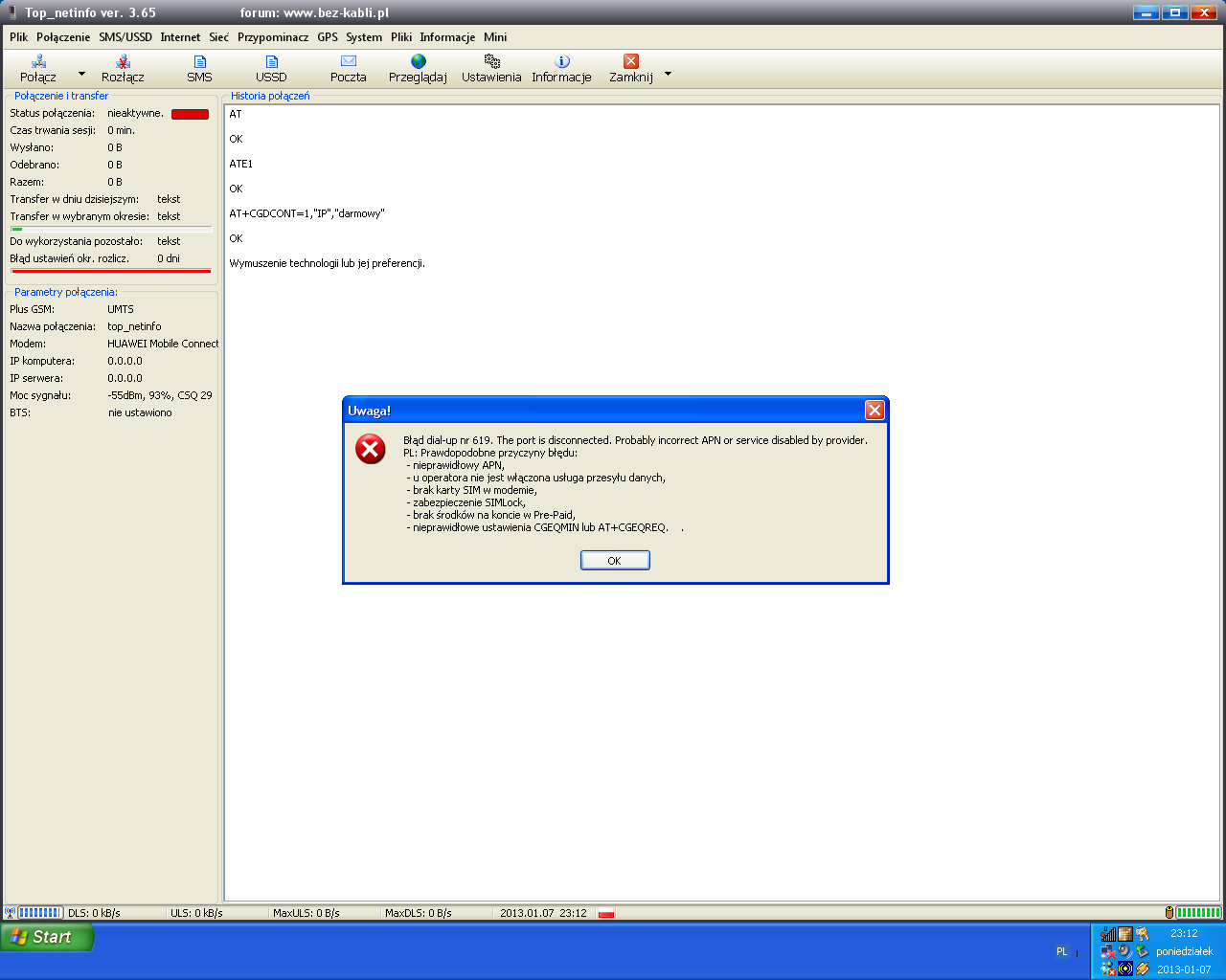 Przyłączam się do problemu. Zakupiony kilka tygodni temu modem Playa E3131-2 przez pierwszy tydzień działał super z karta aero2, potem po którymś restarcie komputera topnetinfo przestał łączyć się z siecią. Dioda miga na niebiesko ale ciągle BLAD DIAL-UP 619 Sad Reinstalacja systemu nie pomogła. Sprawdziłam na oddzielnym laptopie i na nim też wyskakuje błąd dial-up 619. Nie pomaga również restetowanie modemu za pomocą komend w topnetinfo. Modem sprawuje się bez zarzutów z siecią Play. Sygnał elegancki, centrum Łodzi. Załączam zrzuty ekranu z konfiguracja programu, proszę o pomoc gdzie leży błąd Sad Matylda