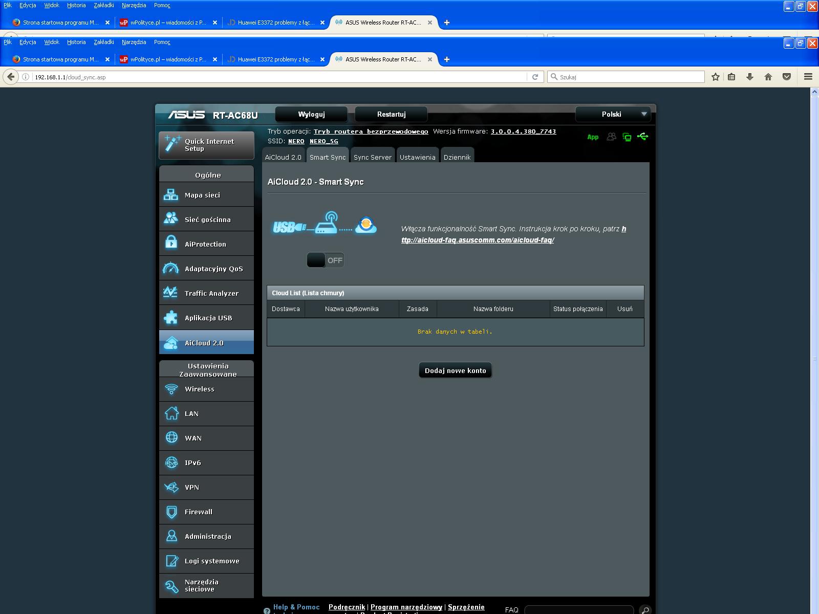Witam . Mam problem z Huawei e3372.Modem podłączony jest do routera ASUS RT-AC68U.Mimo że oficjalnie router nie współpracuje z tym modemem jednak internet działa. Raczej działał do momentu jak brat przjechał ze swoim laptopem z win10 i skorzystał przez wifi z internetu. Nie wiem czy to ma to jakieś znaczenie ale od tego momentu nie mam internetu. To znaczy jedna strona otwiera mi się prawie zawsze inne nie. Podłączyłem modem bezpośrednio do komputera i to samo. Jedna strona otwiera się prawie zawsze inne nie. Robiłem restart . Po restarcie popracował może z 10 minut łącząc się z internetem a potem znów tylko jedna strona się ładowała.Zrobiłem jeszcze raz reboot a potem zapisałem ustawienia do pliku funkcją backup.Teraz za każdym razem jak nie łączy z internetem robię restore z pliku. I działa znów na jakieś 10 może 15 minut. Proszę o pomoc co zrobić by działało to cały czas. Router asusa ma listę modemów z którymi współpracuje może potrzeba wymienić na któryś z nich. Jeśli tak to który polecacie.