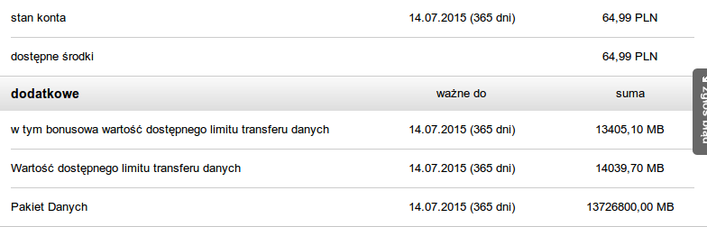 nie mam tam włączonych promocji z tego wątku, są za to środki z doładowania w tym bonusowy pakiet danych (koło 6GB) bo to jest karta której używam normalnie w telefonie (dorzucam załącznik tradycyjnie pozbawiony danych umożliwiających identyfikację)