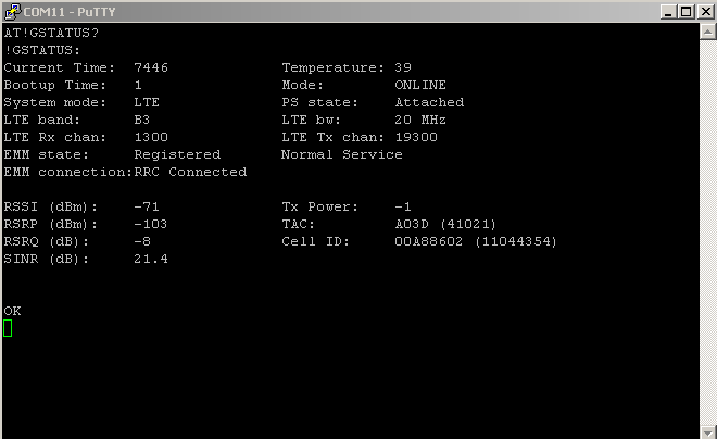 1) sprawdzamy na jakim porcie COM możemy rozpocząć komunikacje: *w testowym przypadku COM11; 2) pobieramy np. darmowy program PuTTY http://www.chiark.greenend.org.uk/~sgtat...nload.html 3) uruchamiamy i ustawiamy tak: 4) otrzymujemy okno konsoli: 5) korzystając z różnych komend możemy dowiedzieć się „to i owo” o naszym modemie, np.: ATI AT!BAND=? i AT!BAND? AT!GSTATUS? *więcej informacji o AT (po angielsku) od Sierra Wireless: http://www.sierrawireless.com/resources/...e-v2.4.pdf Post został założony z prozaicznego powodu: po powrocie to tematu modemów (konkretniej wbudowanych WWAN + LTE) dopiero po chwili przypomniałem sobie o komendach AT, sposobie zapytań itd.