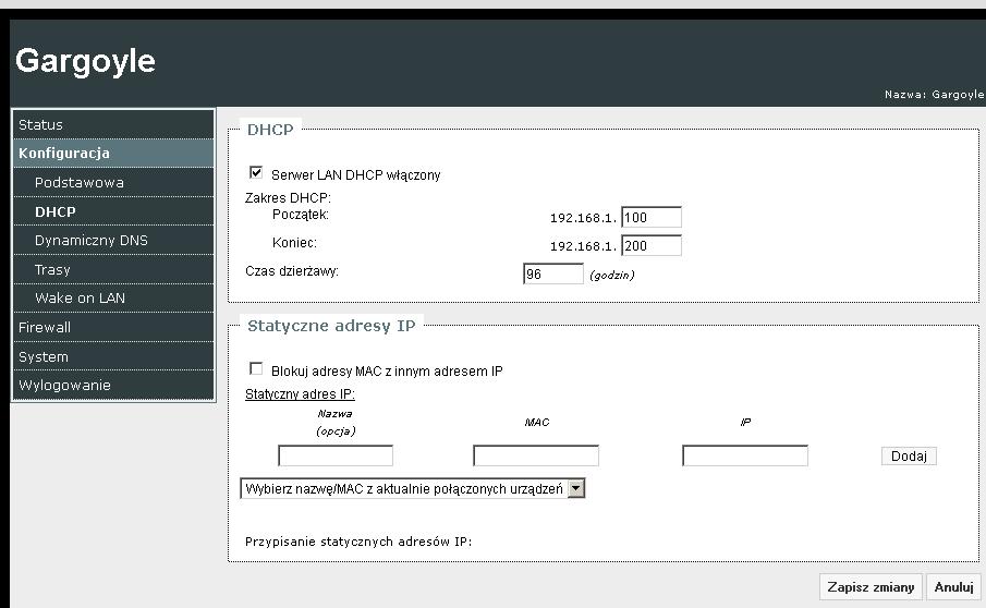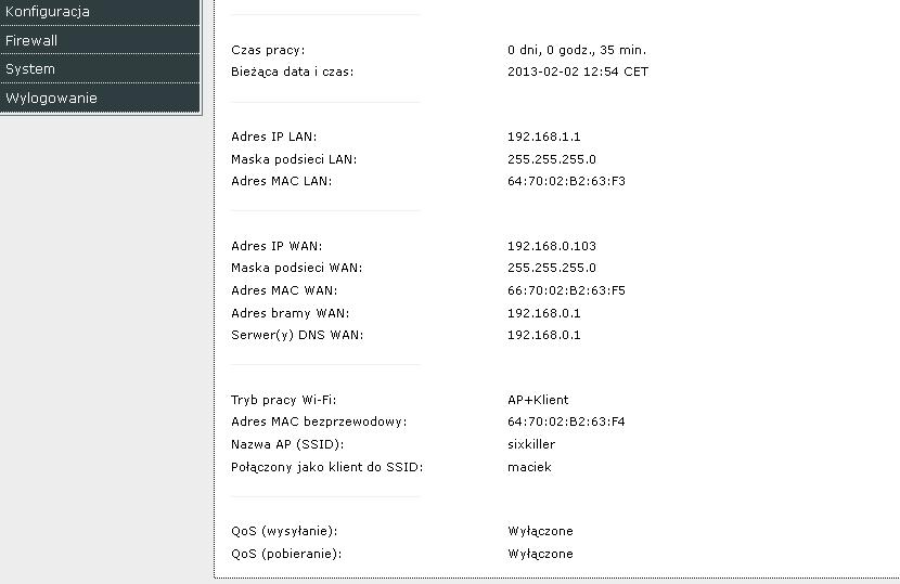 Router pracuje jako brama sieciowa Internet: połączenie DHCP bezprzewodowe Sieć bezprzewodowa ustawiona jako: klient + AP Skonfigurowane połączenie z SSID z ZTE (sieć z WPA2 PSK) Nazwa AP pozostawiona bez zmian (dla wersji z modemem USB), zabezpieczenia także (w tym przypadku musi być WEP) włączone rozgłaszanie SSID oraz DHCP Po zapisaniu ustawień router działa jako klient wifi, udostępnia internet na LAN, sieć wifi o nazwie zgodnej z ustawioną dla AP jest widoczna, jednak po skonfigurowaniu połączenia DHCP nie przydziela adresu IP (zarówno na komputerze z windows jak i tablecie z android) - jak to rozwiązać? jeżeli AP jest ustawiony jako sieć bez żadnych zabezpieczeń DHCP działa poprawnie. Oryginalny software nie zawiera opcji takiej konfiguracji, zainstalowane Gargoyle 1.5.9.2 Ustawienie tp-linka jako mostu bezprzewodowego/przekaźnika funkcjonuje trochę lepiej, jednak tutaj zabezpieczenia muszą być takie same, a dodatkowo co jakiś czas zrywa wifi po stronie klientów (za mr3220) Wysłane z mojego GT-I9100 za pomocą Tapatalk |