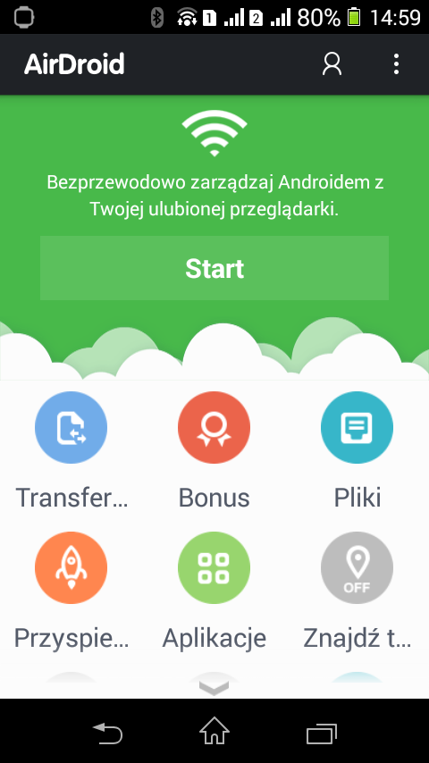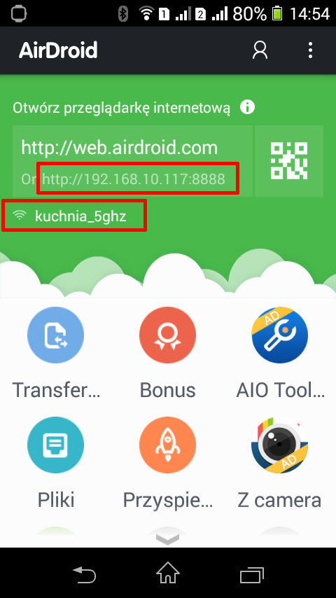 ale zapewne jakiś znajdziesz https://play.google.com/store/search?q=f...rver&hl=pl próbowałeś użyć airdroida? - nie musisz używać płatnej wersji, to co jest darmowe wystarcza do 99% zastosowań, nawet bez roota załączniki z airdroidem ekran startowy, gdzie jest mnóstwo śmieci i kluczowy przycisk "start"po uruchomieniu serwera http w telefonie widoczne są istotne informacje - obrysowałem je czerwonymi ramkami 1) niżej - informacja o połączeniu WiFi z którego korzysta telefon (czy też tablet itd.) 2) wyżej informacja o adresie który trzeba otworzyć w przeglądarce w tym wypadku jest to Kod: http://192.168.10.117:8888nie ma żadnego znaczenia jak komputer jest z nią połączony (w szczególności mam na myśli to czy to połączenie kablowe, czy bezprzewodowe) a to co widzimy w przeglądarce przy skorzystaniu z tego adresu widok ^ oczywiście już w trakcie działań - tu pobierałem w ten sposób screenshoty z telefonu do komputera PS (trochę nie na temat, ale może jednak?) masz zrootowany telefon? Statystyki Folding@home |