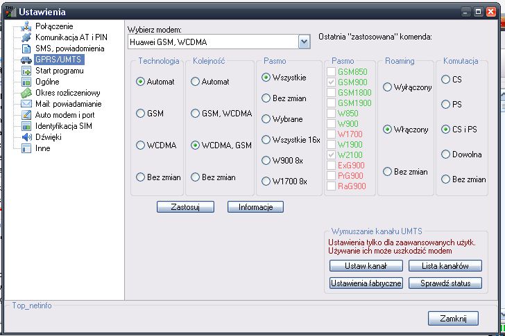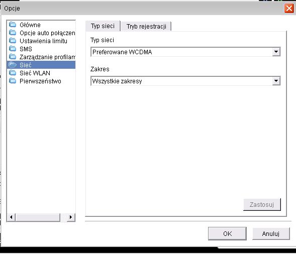 ![]() Ustaw tak: Technologia WCDMA, Kolejność WCDMA,GSM Pasmo Wybrane ptaszek przy W900 Roaming Włączony Komutacja Dowolna i przycisk Zastosuj |
