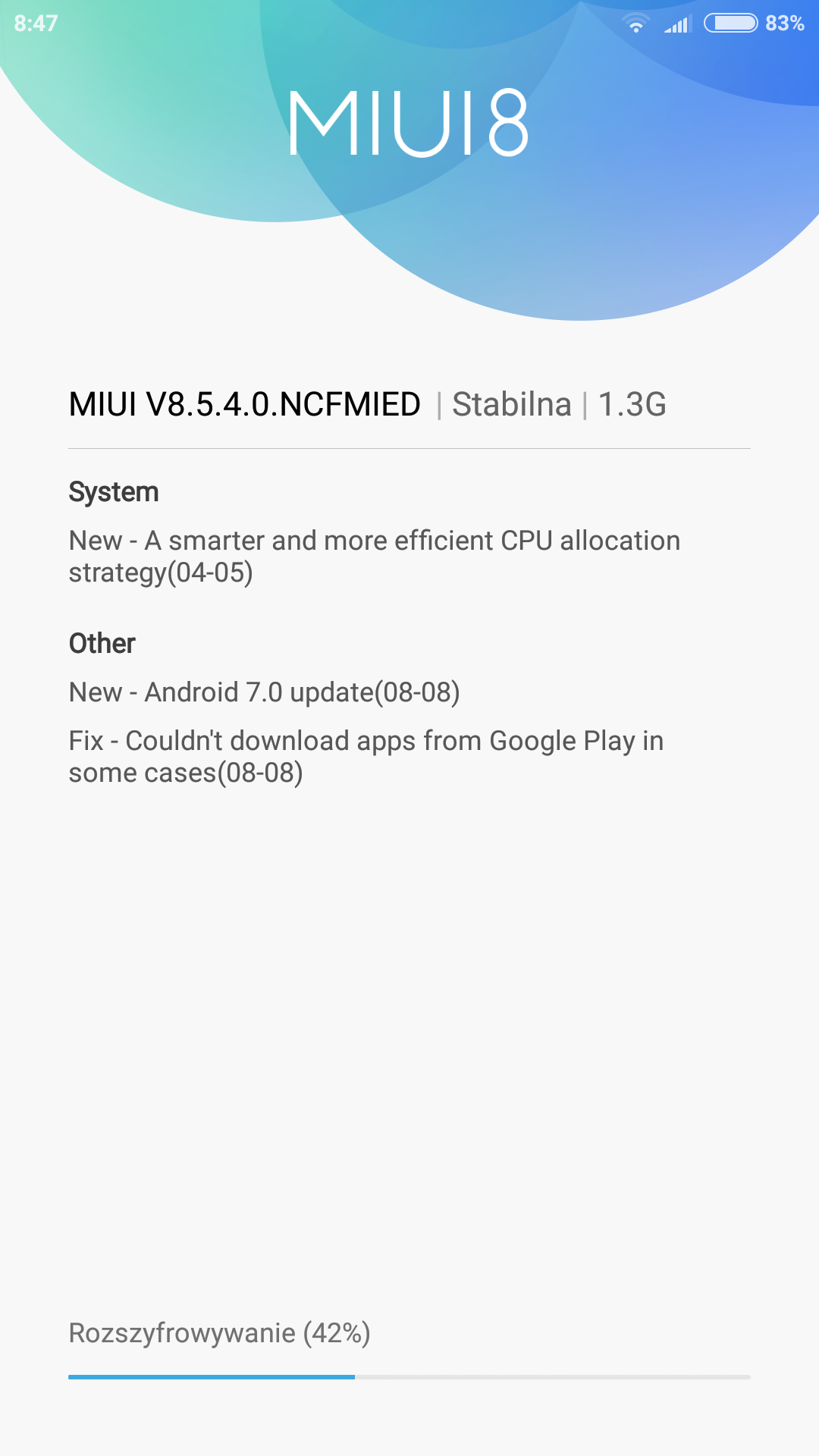 sprawdź czy nie ma już MIUI 9 na twój telefon (bo aktualizację między "dużymi" wersjami trzeba przeprowadzić ręcznie (z użyciem komputera) na telefonie przywróconym do ustawień fabrycznych, więc póki go faktycznie nie zacząłeś używać to jest idealny moment na taką aktualizację Statystyki Folding@home |